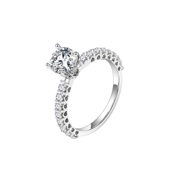 The centerpiece of the ring is a stunning round-cut diamond, securely held by a classic four-prong setting that maximizes its sparkle. The band is adorned with a continuous row of pavé-set diamonds, creating a dazzling display of light and fire. The intricate detailing along the band adds a touch of elegance and enhances the overall brilliance of the ring. The “Splendor” ring is a true testament to meticulous craftsmanship and timeless design. It symbolizes an unbreakable bond and the eternal nature of love, making it a perfect choice for a memorable engagement.